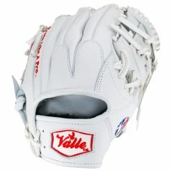 The Valle Eagle PRO 975 Series boasts the highest quality USA Kip leather and USA tanned leather lacing in the Valle trademark all-white colorway. Featuring an I-Web pocket with double lacing and open style wrist back with great fit and feel. You won’t believe it’s a training glove. The Eagle PRO 975 has been our most popular training glove for serious players. The Valle Trademark “Train Like A Pro” is embroidered in red on the backside of the glove. Additional cushioned thumb support and palm padding. Double index pads; Wear with one finger in each finger stall or have two fingers in the pinky stall and still have access to the index finger pad, Finger pads located on both the index finger and middle finger of the shell.